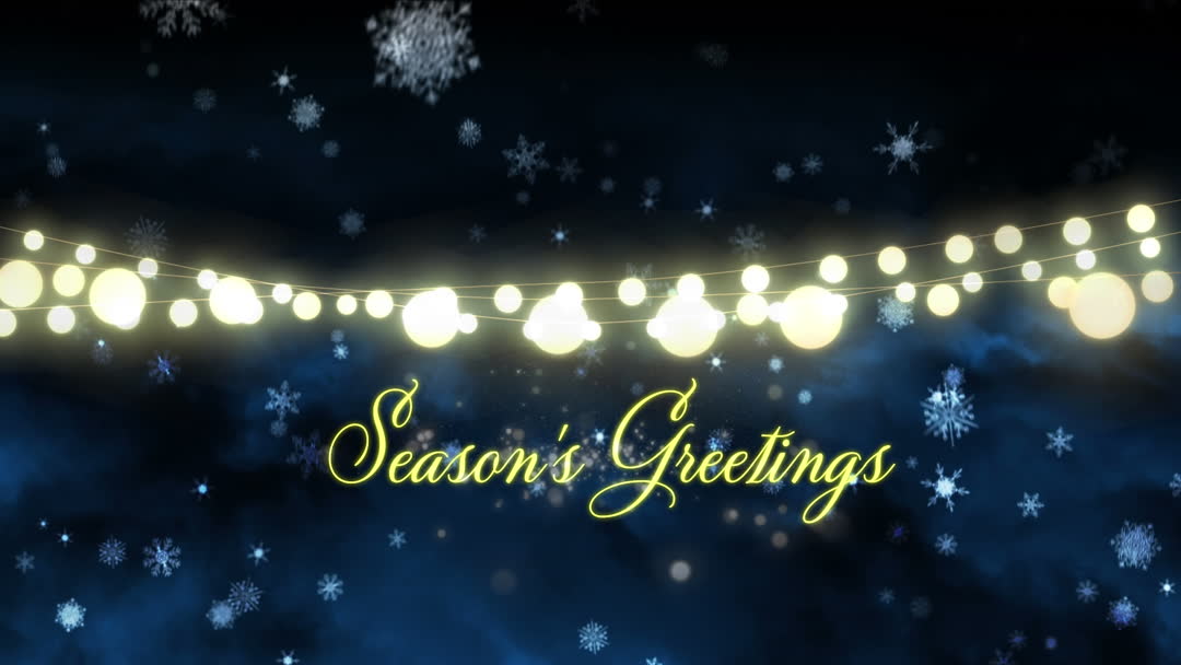 Animated scene includes twinkling string lights and gently falling snowflakes with 'Season's Greetings' displayed. Perfectly suited for holiday greeting cards, seasonal wishes, festive invitations, and enhancing winter celebration themed projects.
