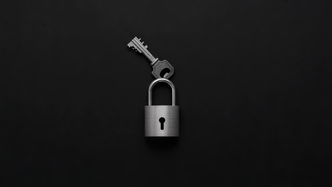 AI Generated Image. Showing tight closeup of silver padlock with key resting on shackle against matte black surface, revealing brushed metal texture and precision key cuts. Emphasizing high contrast, minimalist composition, centered framing and generous negative space for text. Presenting short clip ideal for cybersecurity and data protection videos, password and authentication tutorials, product promos for locks or smart-security devices, brand hero headers, social media ads and editorial content on privacy and safety. Leaving negative space for text overlays, lower thirds and logo placement. Suggesting editing techniques such as slow push-in, gentle rotation, vignette highlight and desaturated background for dramatic effect. Optimizing for 4K and HD timelines, loopable for ambient backgrounds, suitable for corporate training, website hero banners and advertising campaigns.