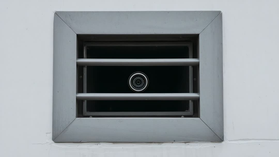 AI Generated Image. Showing security camera peering through metal grille with three horizontal slats mounted on white exterior wall. Centered circular lens revealing dark interior and creating sense of surveillance, focus, and anonymity. Tight framing and neutral color palette suggesting industrial, minimalist aesthetic suitable for editorial and commercial use. Useful for illustrating surveillance, building security, urban monitoring, privacy debates, CCTV installation, and infrastructure coverage. Ideal for use in corporate security presentations, news segments about public safety or privacy, real estate and architecture b-roll, website hero headers, app backgrounds, social media banners, and training materials. Suggestions for customization: cropping to square for social media, adding subtle vignette and desaturated color grade for cinematic mood, overlaying text or icons for infographic, looping short clip for ambient background motion. Delivering clear visual metaphor for monitoring, protection, and modern building technology.