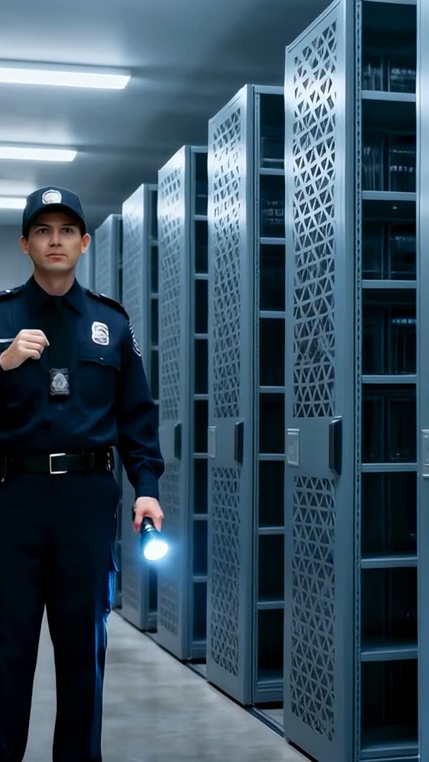 AI Generated Video. Vertical video showing uniformed security guard walking down server rack aisle while shining flashlight and checking cabinets in datacenter corridor. Lighting creating cool blue tones and strong contrasts, highlighting technology and security mood. Useful for cybersecurity, data center security, facility management, and corporate safety themes. Ideal for use in websites, social media vertical ads, training videos, news packages, corporate presentations, and marketing for security services. Providing copy space on right side for headlines, logos, lower thirds.