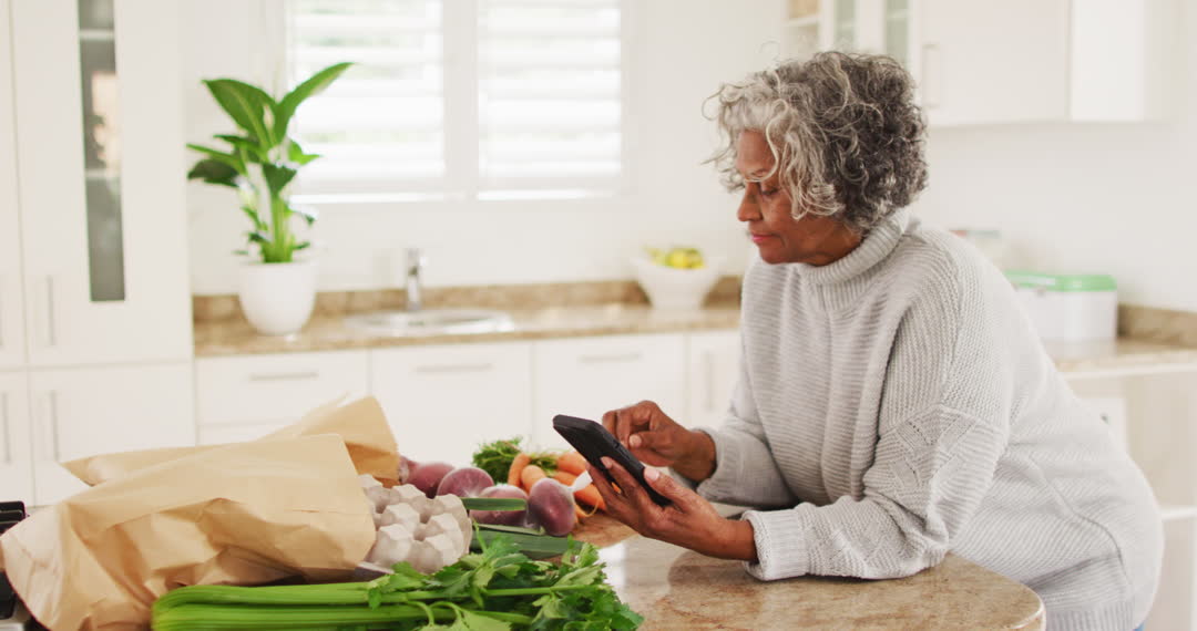 Senior African American woman using a smartphone in her modern kitchen surrounded by fresh groceries, symbolizing a connection with technology. Perfect for depicting themes of active retirement, home living, and the benefits of digital engagement among seniors. Useful for articles on healthy lifestyle choices or digital resources for retirees.
