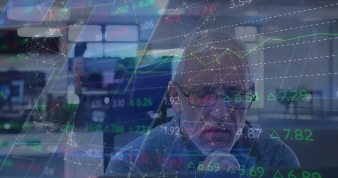 A senior professional is deep in thought while analyzing complex financial data displayed as digital graphics in an office environment. This visual metaphor represents business analytics and modern finance, suitable for use in articles discussing data analysis tools, financial strategies, and technology's role in fields like investment trading and economic forecasting.