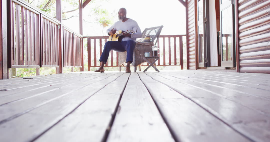 Senior Black man seated on a balcony, happily playing a guitar. He appears relaxed and at peace surrounded by the woody and natural appearance of a log cabin, suggesting a moment of leisure and enjoyment in nature. This scenario could be used in content related to leisure in retirement, relaxation in natural settings, and cultural expressions.