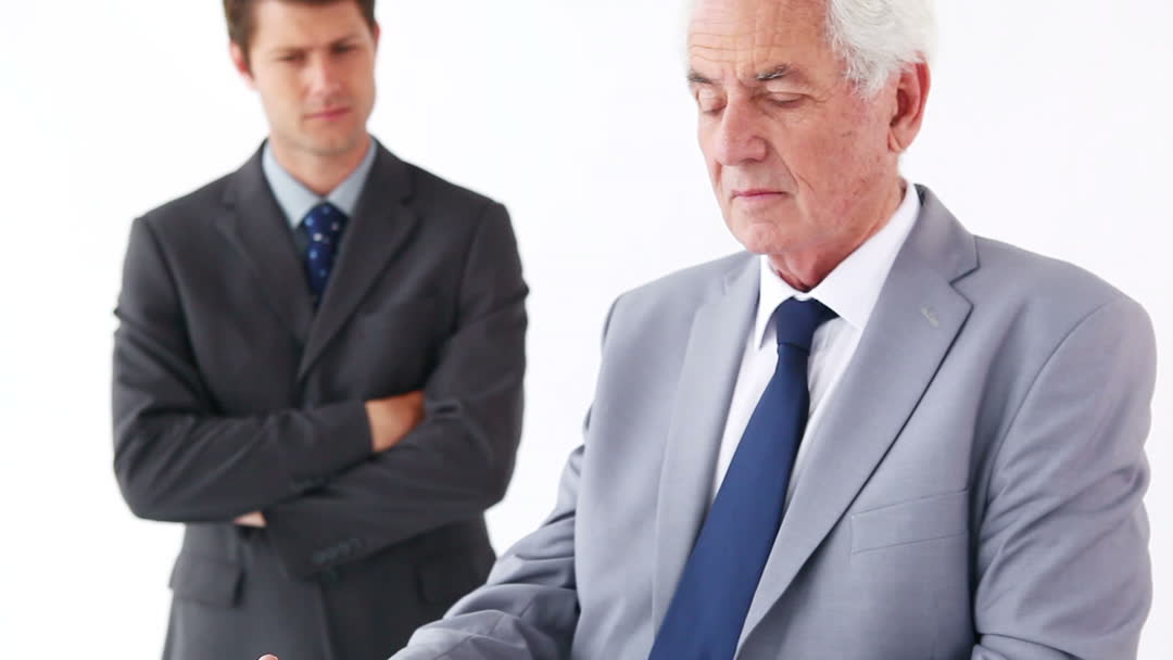 Senior businessman in formal attire using a tablet while his colleague watches in a formal business setting. Ideal for illustrating concepts of digital collaboration, modern business practices, and intergenerational teamwork in corporate scenarios.