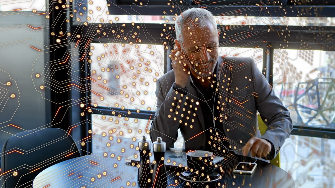 A mature businessman is engaged in conversation over his smartphone, with digital circuitry overlay highlighting global communication and technological advancements. Ideal for promoting concepts of digital innovation, business growth, and the integration of technology in modern enterprises. Perfect for corporate presentations, tech company websites, and social media marketing showcasing executive engagement with new technologies.