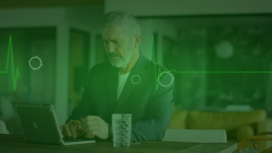 Senior Businessman Using Laptop with Digital Heartbeat Overlay Video