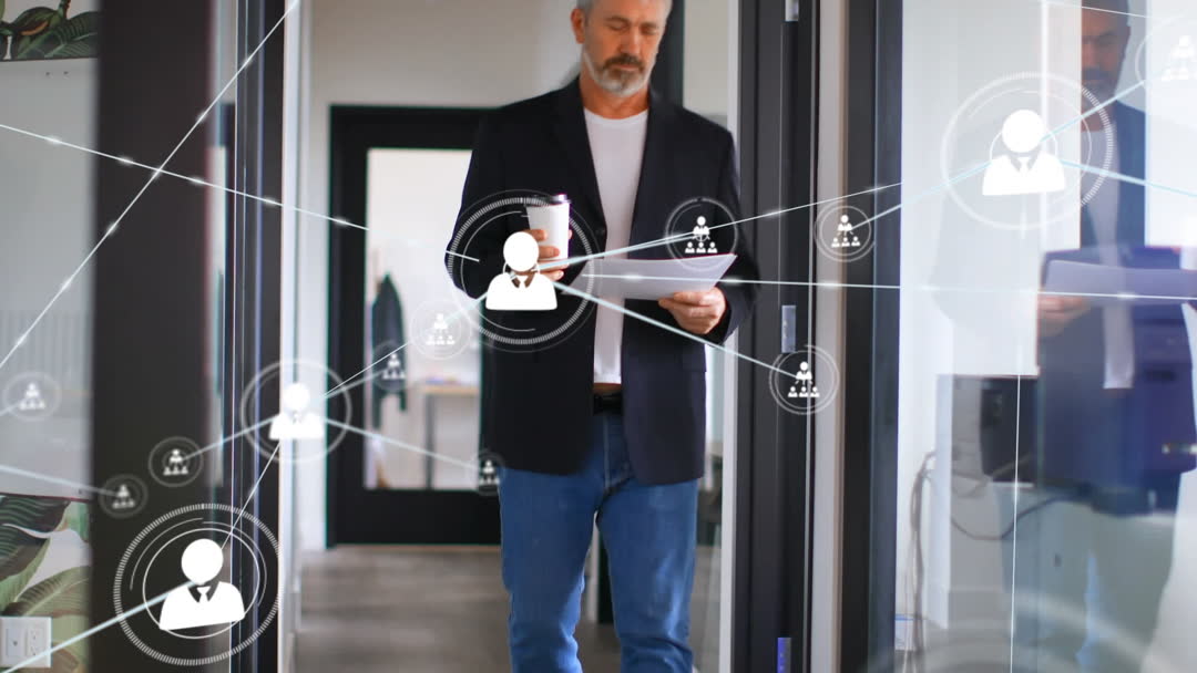 Senior businessman is walking through office hallway holding coffee cup and papers, with digital network icons superimposed, representing modern communication and connectivity in business. Useful for themes of corporate strategy, technology integration, and professional environments. Ideal for business presentations, articles on digital transformation, or promotional materials for tech solutions.