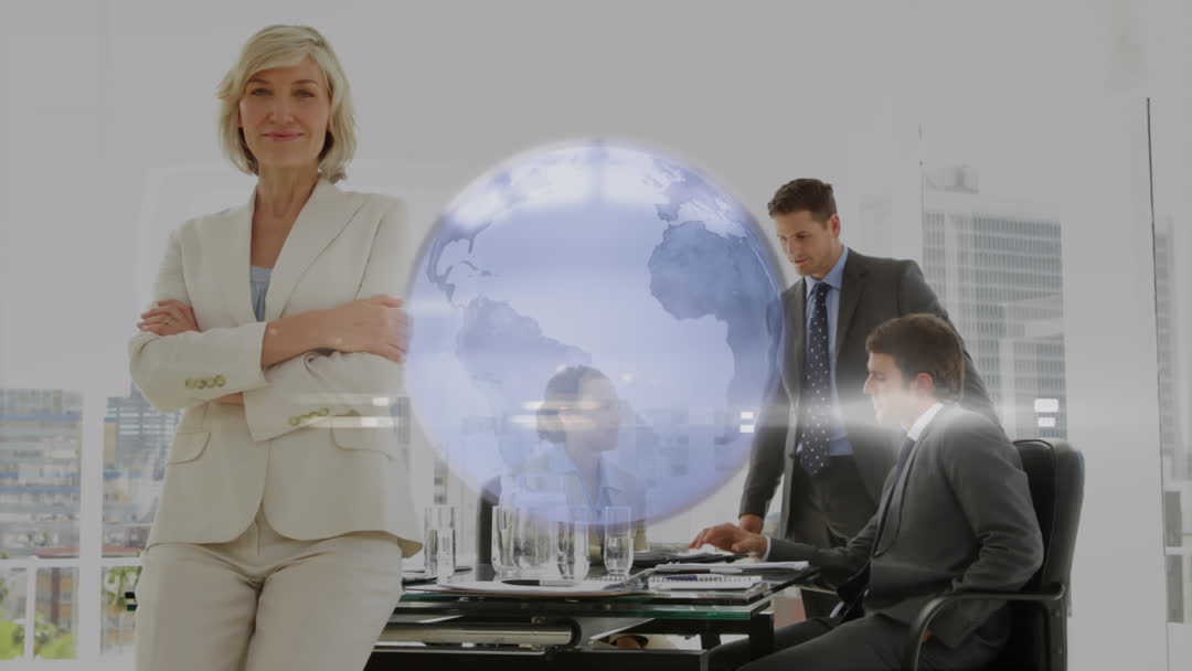 - Senior Businesswoman with Holographic Globe in Modern Office