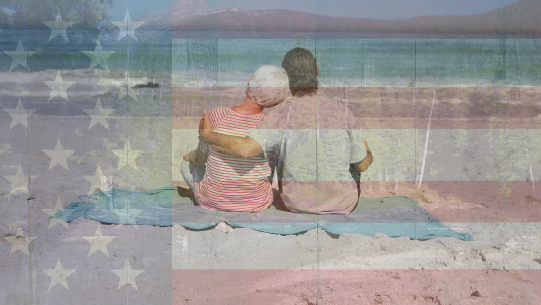 Senior couple relaxing and embracing on a beach with a transparent overlay of the United States flag. Great for illustrating themes of love at an older age, patriotism, freedom, retirement lifestyle, and American culture. Useful for websites and advertisements focusing on senior living, holiday services, and patriotic celebrations.