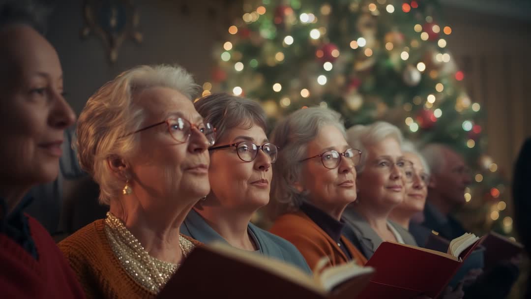 - Senior Choir Singing by Christmas Tree in Festive Gathering