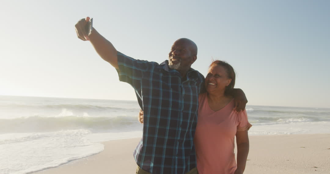 Elderly couple joyfully taking a selfie on a sunny beach, showcasing moments of happiness and companionship during their retirement. Ideal for conveying themes of love, leisure, travel and active senior lifestyle. Perfect for use in marketing materials for holiday packages, senior lifestyle advertising, or social media campaigns promoting healthy aging.