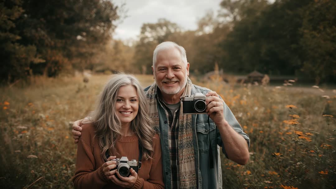 - Senior Couple Capturing Memories with Vintage Cameras in Autumn Meadow