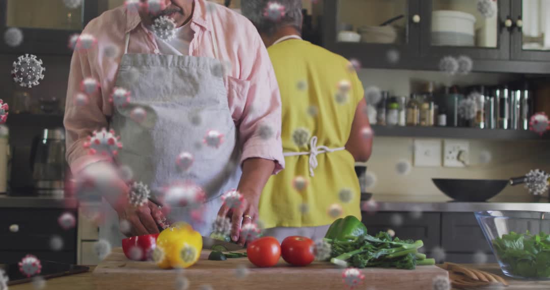 - Senior Couple Chopping Vegetables in Kitchen with Viral Particle Overlay