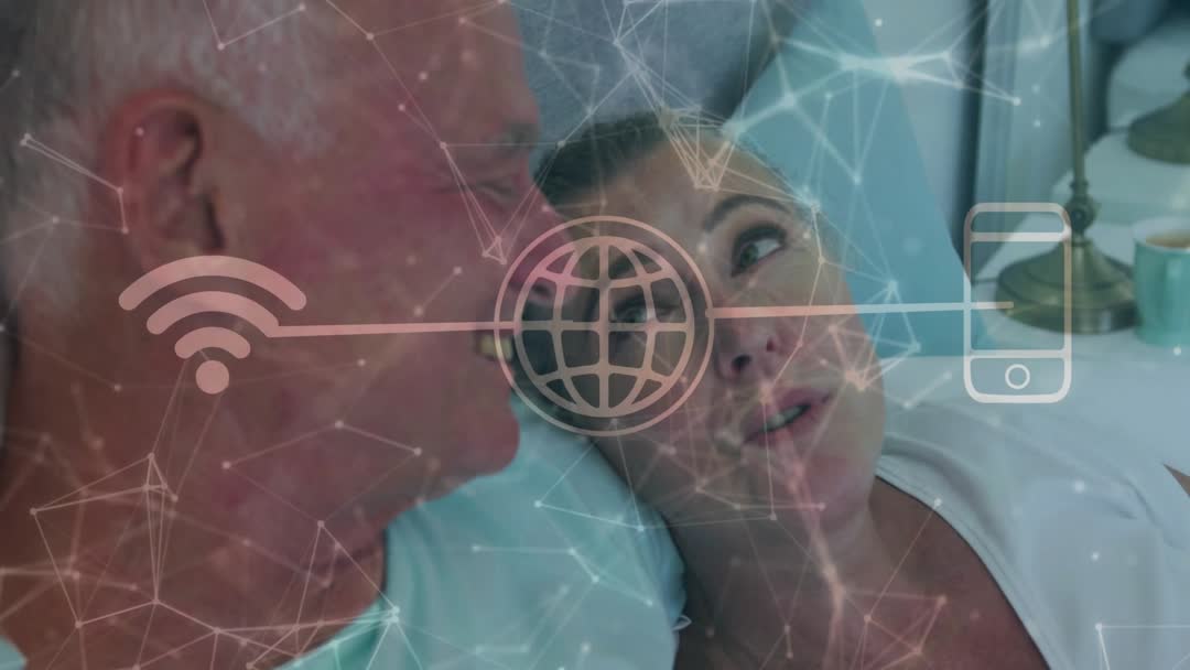 A senior couple comfortably engaging in digital communication in their bedroom, symbolized by connectivity icons. Ideal for representing themes of elderly care, modern communication methods for seniors, intimacy, and lifestyle balance using technology. Useful for articles, advertisements, or materials advocating digital inclusion and connectivity for older generations.