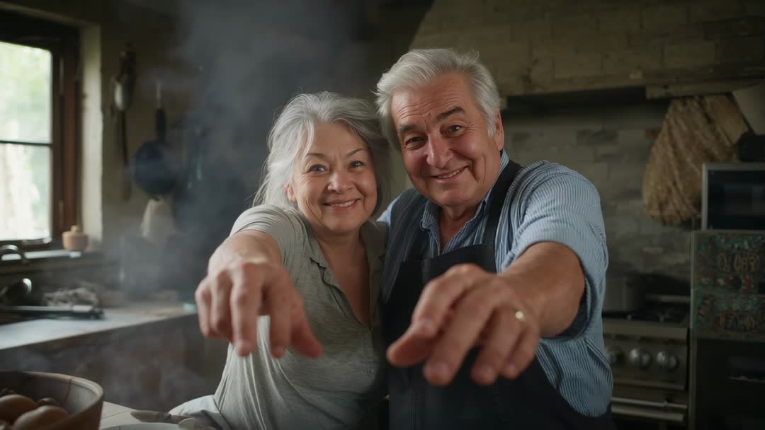 AI Generated Image. Video showing senior couple in rustic kitchen smiling and reaching toward camera as steam rising from pot on stove. Man wearing apron presenting dish while woman leaning close and offering supportive gesture. Warm natural light coming through window and vintage cookware creating cozy atmosphere. Useful for promoting home cooking, recipe videos, cookware advertising, retirement lifestyle content, health and wellbeing campaigns, cooking class promotion, and family or couple lifestyle blogs. Suggested uses include intro clip for culinary channels, b-roll transition for lifestyle spots, hero scene for brand storytelling, banner for senior living materials, or short social media reels. Production notes: overlay upbeat music and recipe text for social reel, add warm voiceover about shared meals for emotional ad, apply warm color grading to emphasize comfort, use slow push-in to heighten intimacy. Clip works well in 5-30 second spots and longer formats.