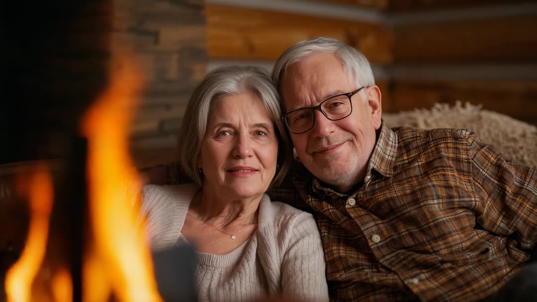 AI Generated Image. Short video clip showing senior couple cuddling on sofa beside flickering fireplace in rustic cabin interior. Man wearing plaid shirt leaning close while woman in knit cardigan smiling softly, creating intimate and relaxed mood. Warm golden light and wood-paneled background enhancing cozy atmosphere and sense of connection. Ideal for illustrating retirement lifestyle, relationship stories, senior care advertising, holiday or winter marketing, real estate for cabins, and emotional brand campaigns. Suggested uses include website hero banners, social media reels, brochure covers, blog hero visuals, healthcare and assisted living promotions, greeting card or newsletter footage, and testimonial backgrounds. Composition offering left-side negative space near fireplace for headline or overlay text and adaptable cropping for vertical or square video formats.