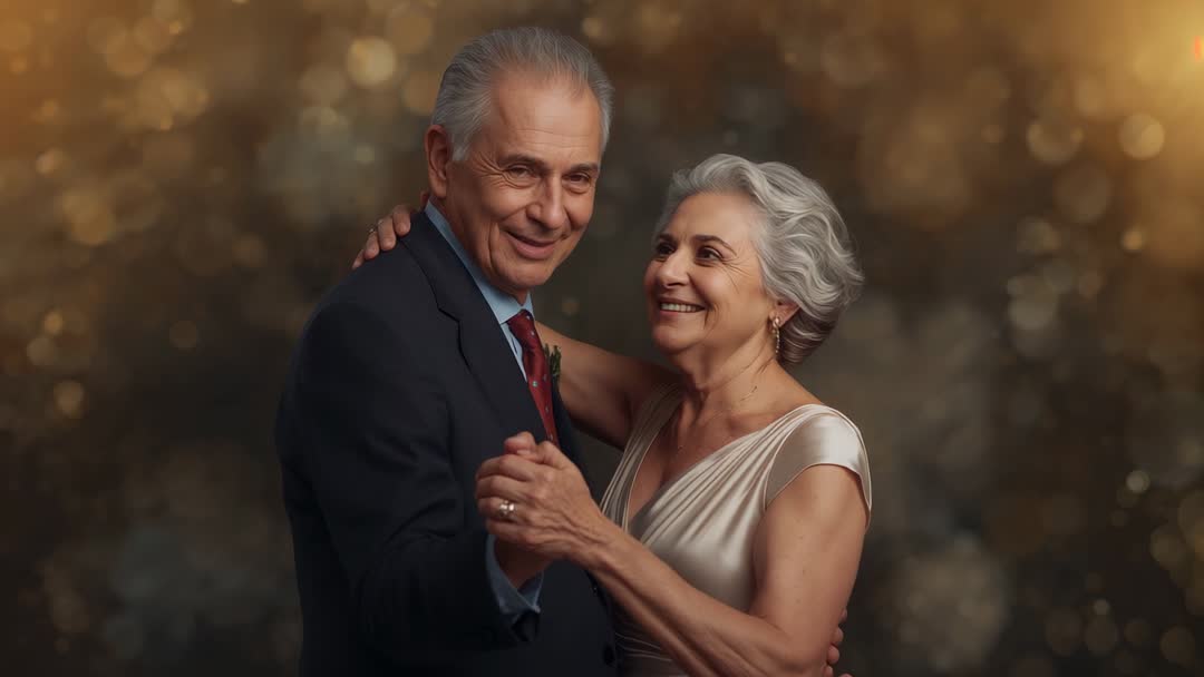 AI Generated Image. Video clip featuring senior couple dancing slowly in formal attire against warm golden bokeh. Man wearing dark suit and red tie with boutonniere, woman wearing champagne satin gown and elegant updo, both smiling and holding hands while swaying. Soft studio lighting creating cinematic romantic mood with shallow depth of field and warm color palette. Useful for wedding anniversary campaigns, retirement community marketing, elder care lifestyle features, romantic playlist backgrounds, greeting cards, TV spots, website hero banners, social media reels. Suitable for use as opener or cutaway in documentary about long-term relationships, background for voiceover about aging gracefully, overlay for event invitations and ballroom dance promotions. Clip adapting well to slow-motion, close-up crop, color grading.