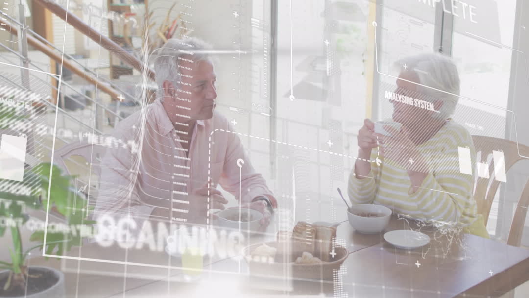 Senior Couple Dining with Futuristic Data Overlay Concept Video
