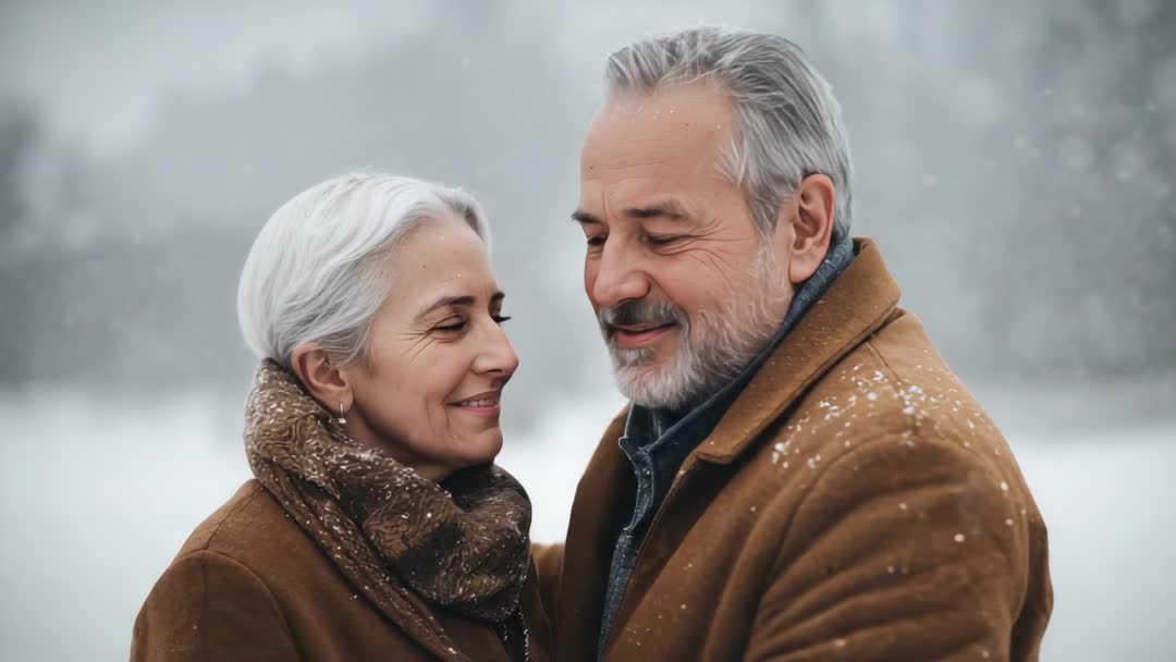 AI Generated Image. Video clip showing mature couple embracing, gentle snow falling around them. Close-up medium shot capturing tender smiles and soft eye contact, shallow depth of field producing blurred winter background. Wardrobe featuring matching brown coats and textured scarf with visible snowflakes on shoulders. Footage conveying warmth, companionship, long-term partnership and quiet romance during cold season. Ideal for winter holiday campaigns, retirement community promotions, healthcare and wellbeing stories, relationship and lifestyle articles, greeting cards, social media posts, website hero banners and targeted advertising for travel or fashion brands focused on mature audience. Editing suggestions: apply warm color grade to enhance skin tones, use slow-motion playback for emotive moments, add soft instrumental music and subtle title overlay in upper third, and leave negative space on left side for text or logo placement. Licensing note: suitable for commercial, editorial and lifestyle use.