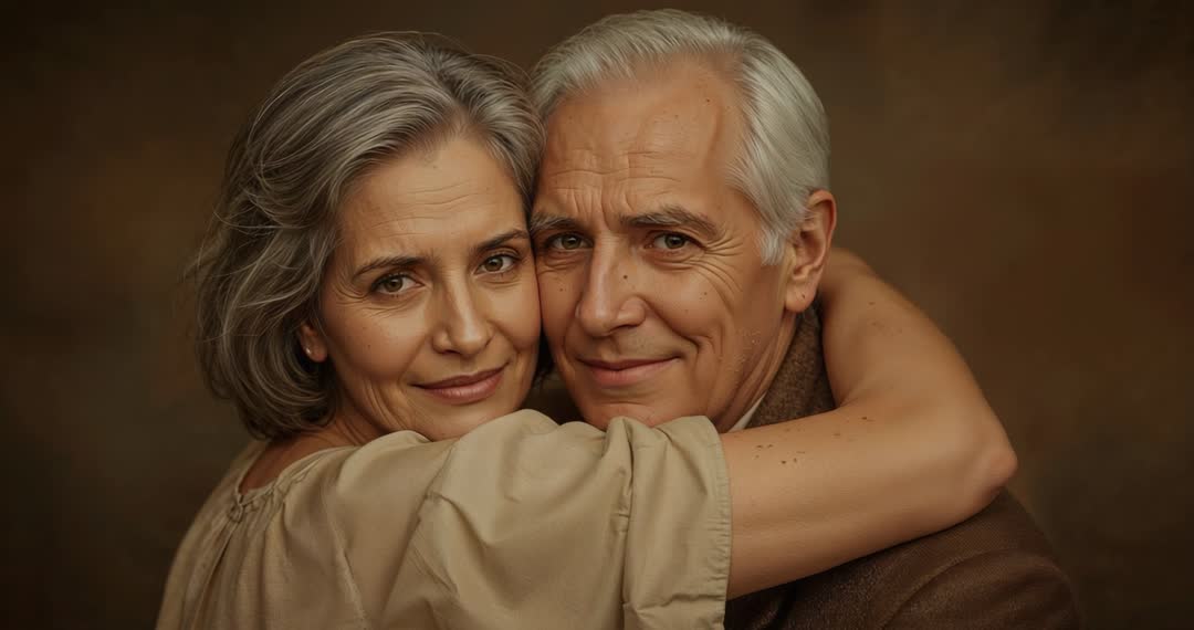 AI Generated Image. Video captures an elderly couple sharing a tender, warm embrace with genuine connection and affection in a soft studio background. Ideal for storytelling themes of enduring love, companionship, senior living, or commercials and promotional high-quality visuals seeking to portray authentic emotional bonds.