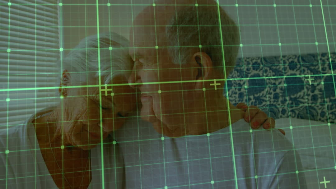 Senior couple gently embracing with a digital grid overlay symbolizes harmony between human connection and technology in healthcare. Useful for themes related to aging, medical technology, and elder well-being. Ideal for illustrating the intersection of modern tech with the compassionate care in medical industries.