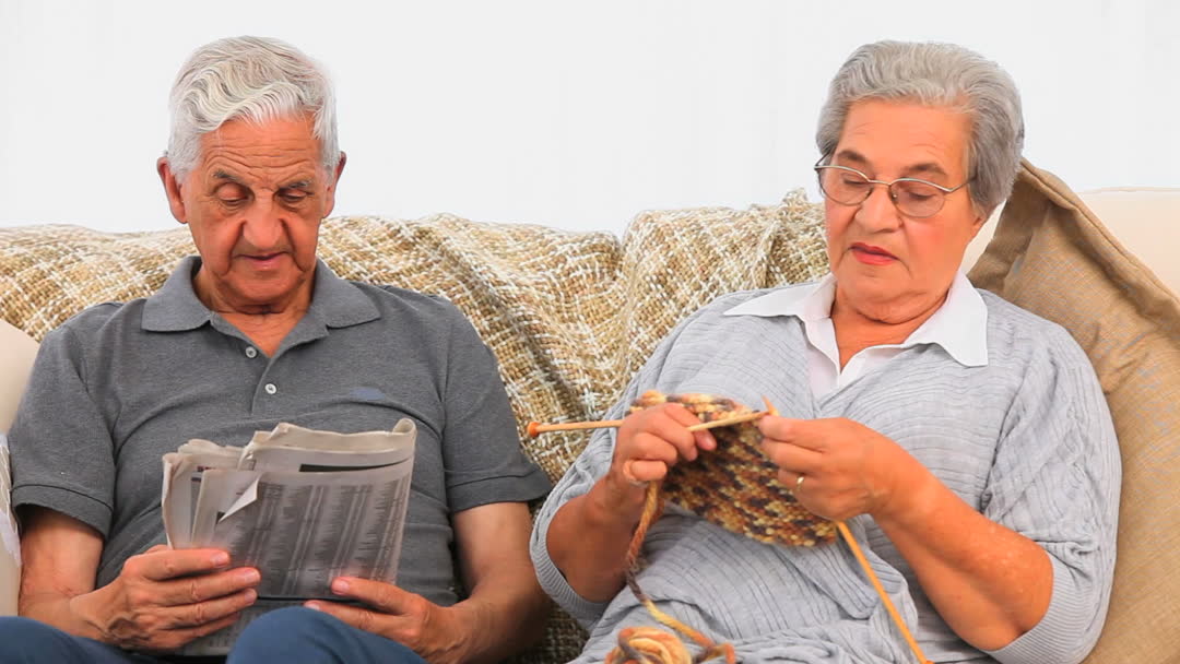 Elderly couple enjoying time together in comfortable home environment. Woman is knitting with concentration while man is engaged in newspaper reading. Perfect for depicting serene senior lifestyle, retirement activities, or actively aging. Great for advertisements focused on retirement planning, home care services, or hobby interests.