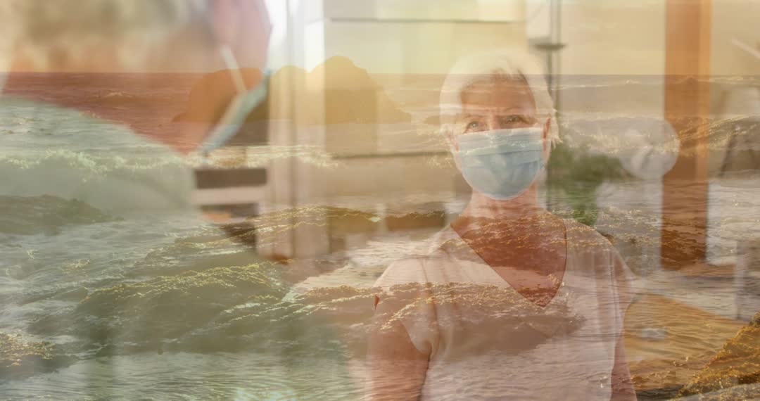 A senior couple practicing mindfulness and relaxation exercises at home with a calming ocean wave overlay. Ideal for promoting wellness, active aging, and relaxation products. Use in content focused on fostering a tranquil home environment, combining natural elements with daily routines for mental and physical health improvement.