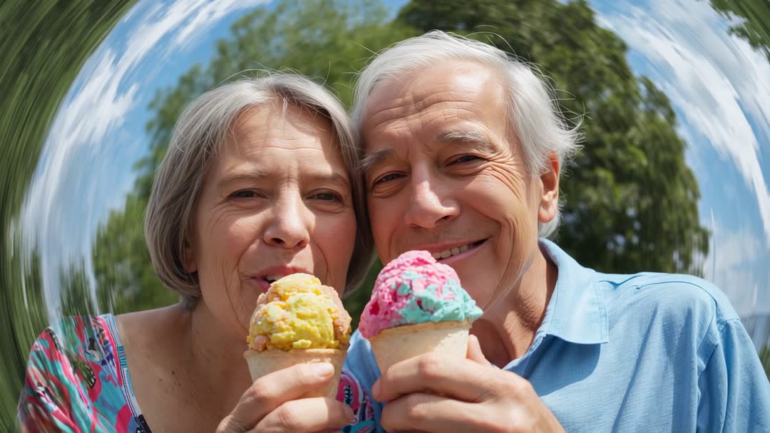AI Generated Image. Featuring senior couple enjoying colorful ice cream cones with joyful smiles and close facial detail, framed by radial swirl background motion adding playful dynamic energy. Capturing candid moment of sharing and connection between older adults during sunny outdoor leisure, emphasizing warmth and youthful spirit. Working well for marketing campaigns, social media posts, blog articles, retirement community promotions, summer festival advertising, dessert shop menus, healthcare wellness pieces, and greeting card designs. Suggesting layouts with copy space at top or sides, color grading to match brand palette, and slow-motion clip selection for longer video storytelling.