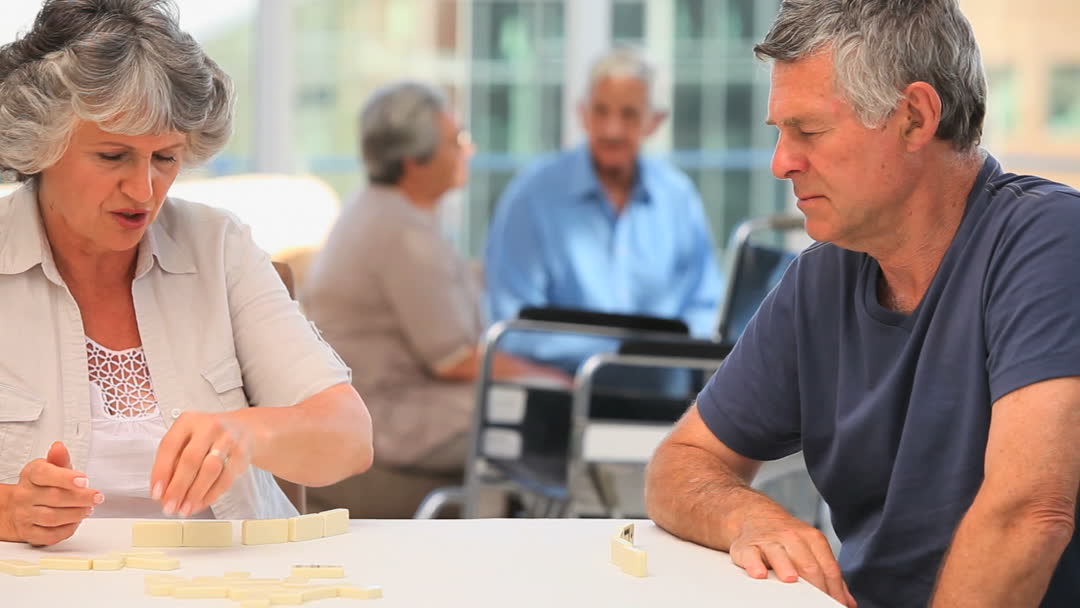 A senior couple is playing a game of dominoes indoors, with other elderly residents in the background. Perfect for illustrating leisure activities in retirement or nursing homes, themes of active aging, or companionship among seniors.