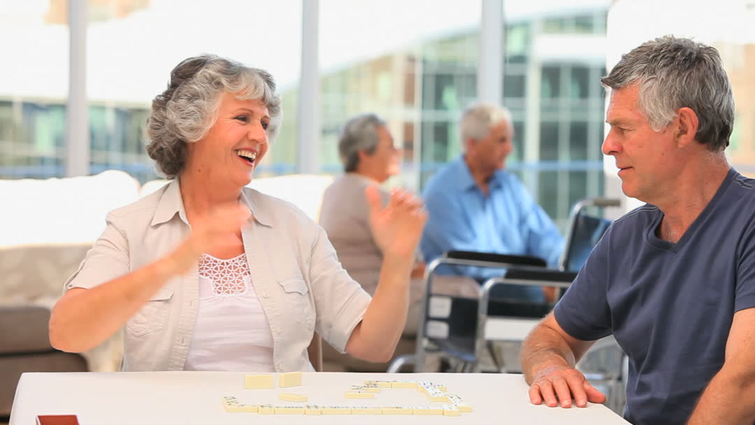 Elderly couple engaging in a friendly game of dominos, suggesting a joyful social activity in a retirement community. This video can be useful in depicting active aging, community gathering, and promoting social activities for seniors. Ideal for articles or campaigns on senior lifestyle, retirement activities, and mental wellness.