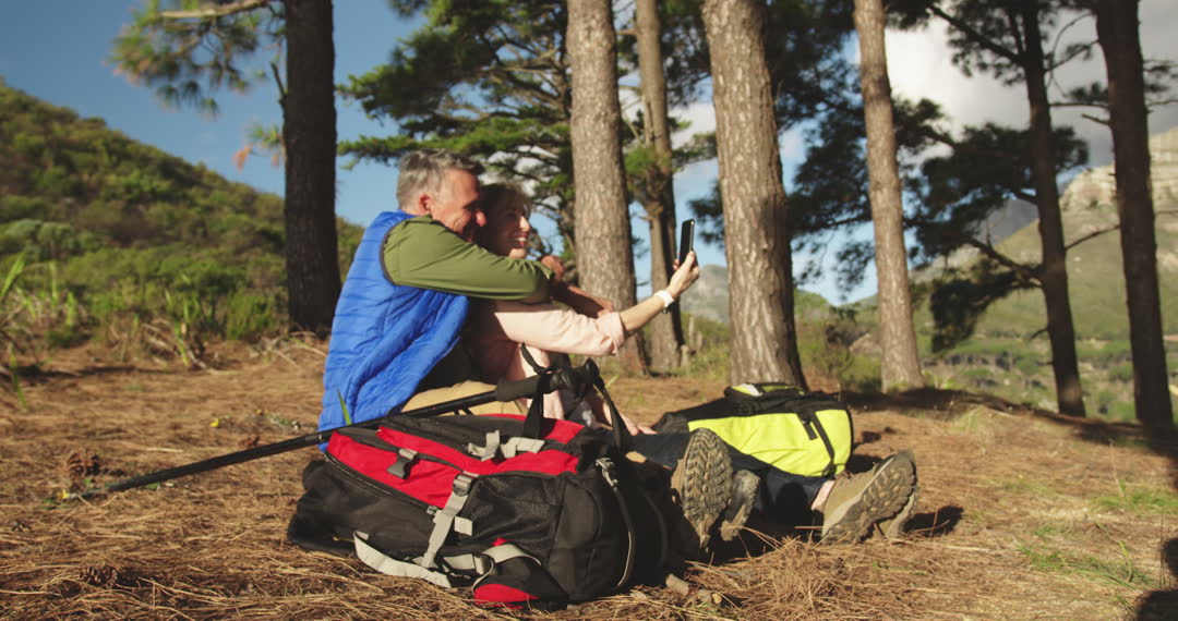 Senior couple sitting on grassy ground in forest taking a selfie. Subjects setup with backpacks and Nordic walking sticks. Image captures serene happiness, perfect for promoting outdoor activity, tourism advertising, or illustrating healthy lifestyle blogs.