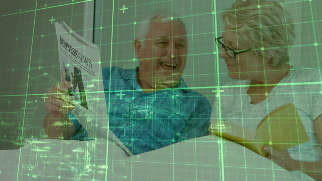 Image depicts a senior couple engaging with a newspaper, with an animated digital interface overlaid, reflecting the blend of traditional media and modern technology. Useful for visuals emphasizing the intersection of technology and everyday life, particularly for market concepts like global business or retired lifestyle. Could be used in articles, marketing materials, or advertisements that target an older demographic adapting to digital innovations.