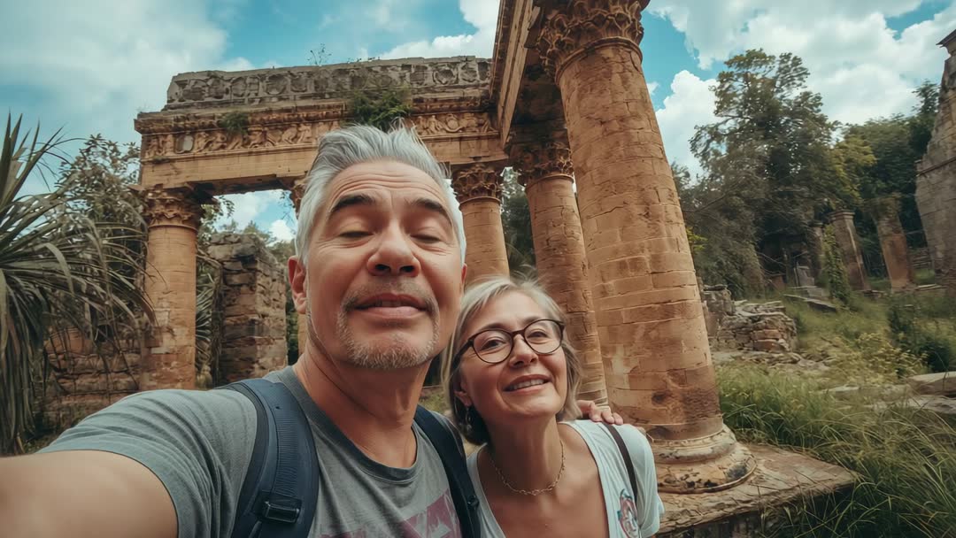 AI Generated Image. Featuring mature couple exploring ancient stone ruins, taking handheld selfie in front of ornate columns and carved archway. Man holding smartphone at arm length, woman adjusting glasses and smiling directly at camera. Warm earthy tones and overgrown greenery adding historic character while cloudy blue sky providing soft contrast. Low-angle, wide-perspective framing creating immersive vlog-style footage and conveying personal travel moment and cultural discovery. Working well for travel vlogs, destination marketing, tourism websites, heritage promotion, social media reels, and senior lifestyle campaigns. Suitable for video opener, thumbnail clip, background B-roll, promotional ad for cultural tours, or editorial feature about active retirement and memory making.