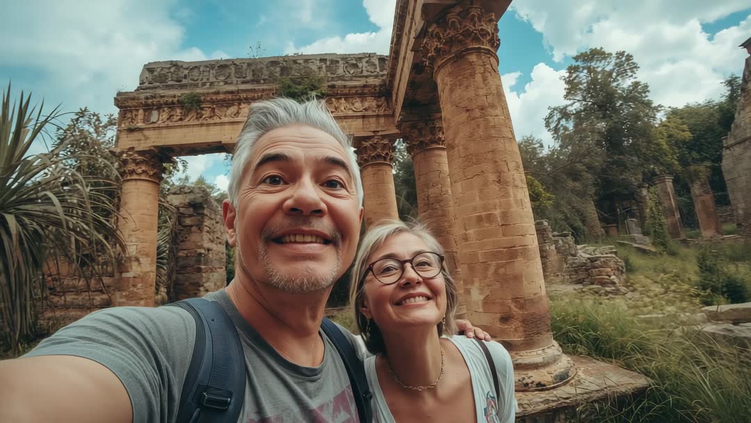 AI Generated Image. Showing senior couple filming selfie tour while exploring ancient ruins with backpacks and big smiles, framed by tall stone columns and ornate archway. Camera angle suggesting handheld wide-angle capture with dynamic foreground focus and expansive backdrop of trees and sky. Lighting delivering warm daylight tones and natural contrast, creating friendly travel mood. Working well for travel vlog intros, heritage tourism promos, retirement lifestyle campaigns, social media travel posts, website hero banners, travel agency ads, cultural documentary sequences, lifestyle blogs about active aging. Use clip as opener for guided tour videos, background for travel app hero, promotional material for historic site preservation, or b-roll for senior lifestyle storytelling.