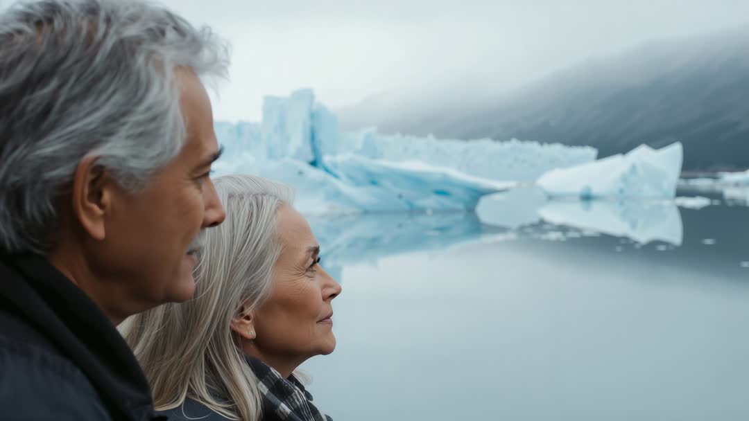 AI Generated Image. Video showing senior couple gazing across glacial lake toward iceberg reflection on calm fjord. Scene portraying quiet companionship, reflective mood, and strong connection with pristine nature. Suitable for travel and tourism promos, retirement lifestyle features, environmental and climate awareness campaigns, wellness and mindfulness content, and documentary or b-roll libraries. Working well as full-screen website hero, social media reel, promotional ad, or inspirational slideshow background. Suggest adding ambient nature sound or soft piano and placing text overlay on right-side negative space for headline or call to action.