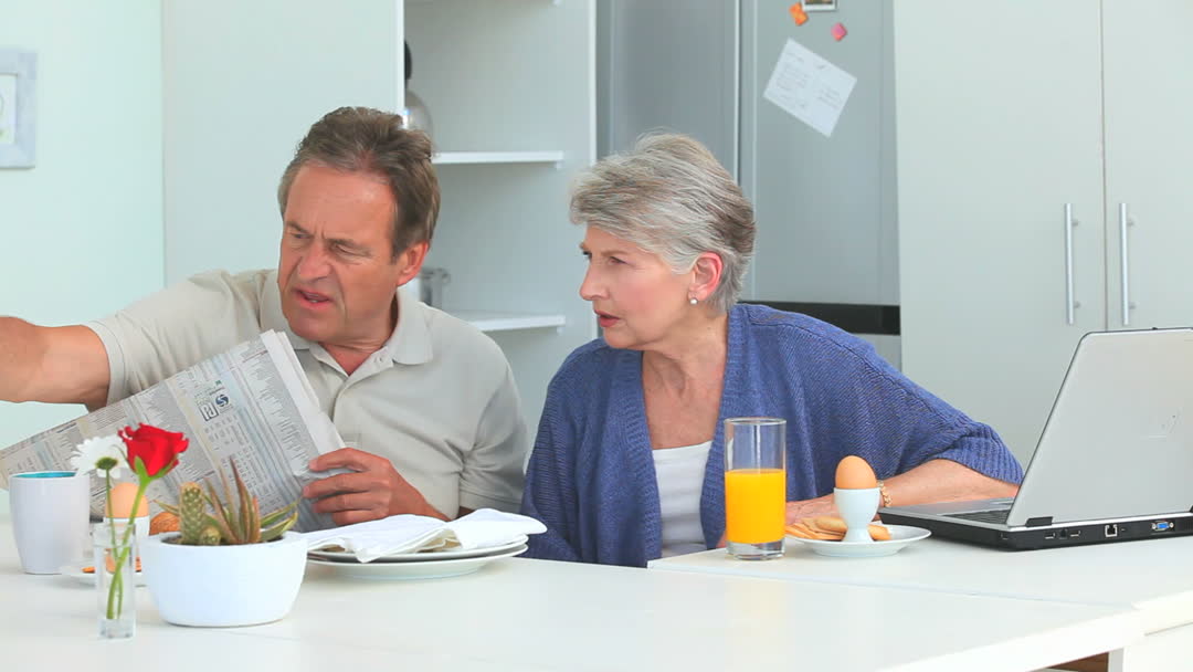 Elderly couple enjoying a peaceful breakfast time at home. The video involves reading a newspaper, sipping orange juice, and having a conversation. This setting exemplifies a serene and routine lifestyle for retired individuals, presenting themes such as relaxation, bonding, and daily life. Useful for illustrating lifestyle articles, retirement planning, home life scenes, and advertisements targeting senior living and health care services.