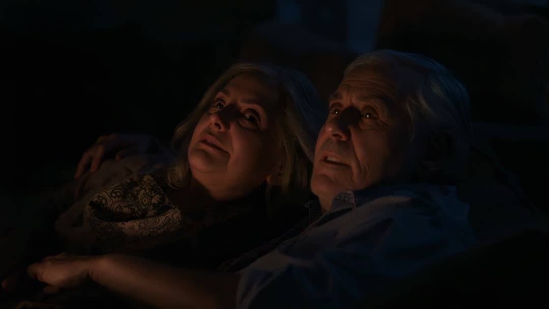 - Senior Couple Lounging and Watching Flickering Light on Couch at Night