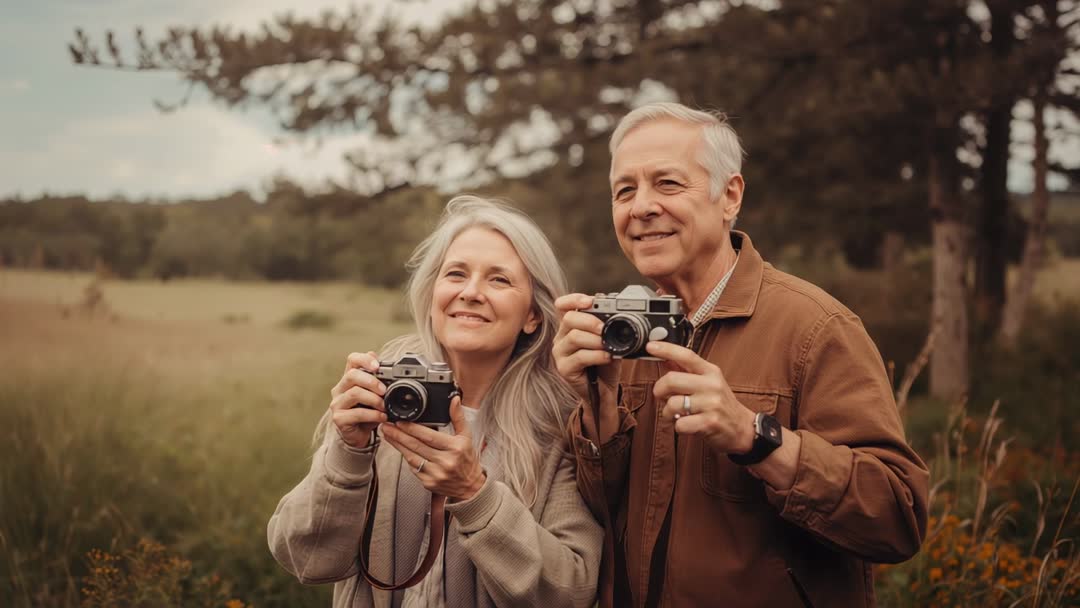 AI Generated Image. Scene showing senior couple in meadow raising vintage cameras and smiling while scanning distant landscape. Warm golden tones and shallow depth of field creating nostalgic, intimate atmosphere. Footage fitting travel and lifestyle campaigns, retirement community marketing, camera and photography product ads, social media reels, website hero banners, blog covers, workshop promos, greeting card motion loops. Suggestions for use: add gentle acoustic music and slow horizontal pan for emotional appeal; cut to tight shots of hands and camera dials for editorial detail; overlay headline text promoting memory making, active retirement, or photography classes. Visual narrative conveying partnership, shared hobby, and joyful aging, helping brands connect with mature audiences.