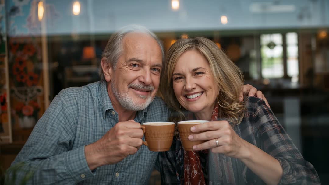 AI Generated Image. Video clip showing senior couple sitting close at cafe window, raising ceramic mugs and toasting camera while smiling. Warm natural light and shallow depth of field creating cozy, intimate mood with soft bokeh highlights. Outfit featuring plaid shirt and patterned scarf adding casual, seasonal vibe. Composition capturing close-up facial expressions and gentle physical contact, emphasizing companionship and lifelong bond. Footage suiting marketing for retirement communities, senior lifestyle blogs, coffeehouse branding, hospitality promotions, relationship and dating content, healthcare campaigns promoting social connection, greeting cards, and social media storytelling. Composition working well for website hero clips, social ads, TV spots, editorial features, and promotional reels; crop-friendly for square and vertical formats. Suggested usage including tagline about companionship, lifelong love, cozy mornings, or simple everyday joys; pairing with warm acoustic music or soft piano for emotional resonance.