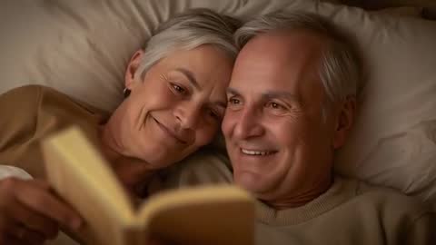 AI Generated Video. Video showing senior couple reading bedtime novel together in cozy bedroom, sharing warm smiles and gentle laughter. Close-up framing capturing facial expressions and warm low light, conveying comfort, trust and long-term companionship. Footage suiting use in advertising for retirement communities, healthcare and wellbeing campaigns, relationship and lifestyle articles, book trailers, bedtime routine videos, family-focused social media posts, eldercare training materials and greeting card designs. Clip working well as hero background for website banners, video ads, YouTube thumbnails and marketing promos. Color palette and composition supporting intimate, comforting mood; pacing and framing allowing seamless looping and voiceover overlay. Provide extra frames for cutaway shots, lower-third placements and headline text overlays. Ideal for storytelling projects highlighting senior wellness, lasting love and cozy home life.