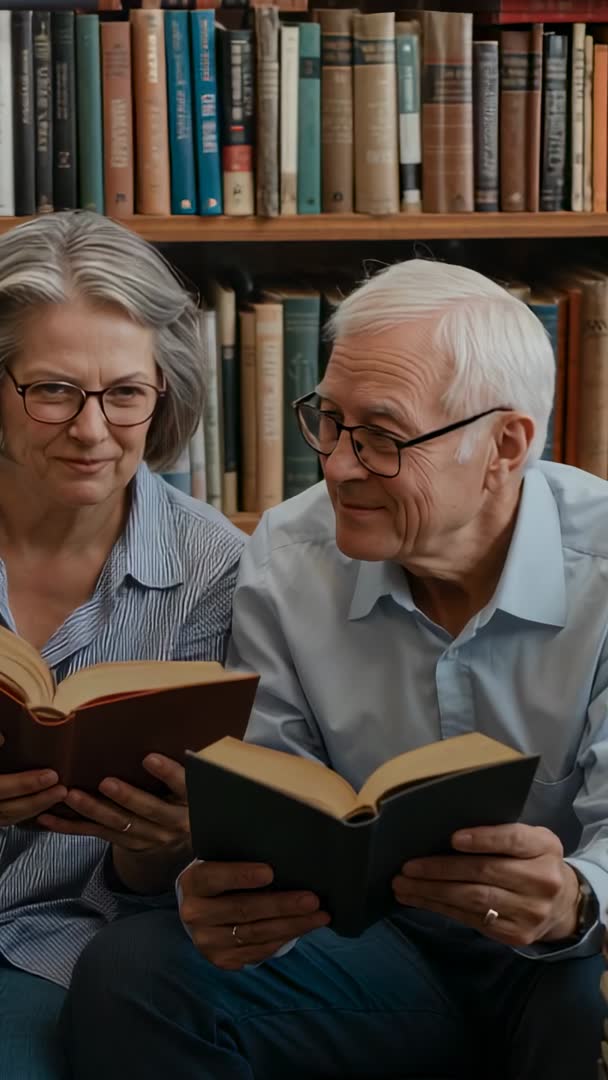 AI Generated Video. Video showing senior couple reading together at home, sharing warm smiles and quiet conversation while holding hardcover books. Close framing capturing glasses, page turning, bookshelf background and expressions conveying companionship and lifelong learning. Lighting remaining warm and natural, creating cozy, intimate mood suited to calm, reassuring narratives. Usage ideas: Using for social media vertical formats including Instagram Reels, TikTok, YouTube Shorts; using for retirement community marketing, elder care and healthcare campaigns; using for library promotions, book club outreach, lifestyle and wellbeing blogs; using as stock footage for educational content about aging, reading and mental wellness. Editing tips: Cropping for mobile vertical aspect, adding soft piano soundtrack and subtle warm color grade, adding captions for accessibility, using gentle transitions to emphasize calm, intimate atmosphere.