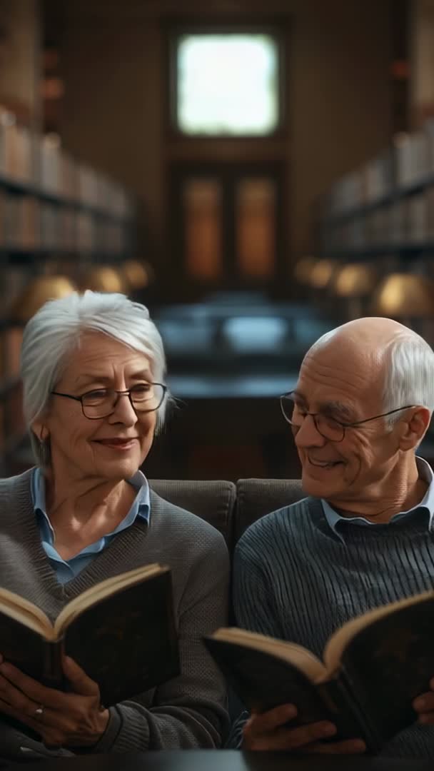 AI Generated Video. Video showing senior couple sitting on library couch reading books and sharing warm smiles. Soft lamp light creating cozy atmosphere, bookshelves receding into background, camera holding steady on midshot with occasional slow push for intimate feeling. Close-up frames capturing gentle eye contact, page turning, and subtle gestures. Ideal for use in elder care campaigns, retirement lifestyle content, library promotions, literacy programs, relationship and family storytelling. Perfect for social media vertical ads, mobile-first websites, corporate wellness videos, educational spots, and TV commercials. Editing suggestions: cropping for mobile platforms, adding gentle piano or acoustic guitar soundtrack, using warm color grade to enhance cozy mood, including soft voiceover about lifelong learning or companionship, adding subtle lower-third text for messaging. Loop-friendly short clip for background visuals or montage use. Licensing-friendly stock footage for commercial and editorial projects.