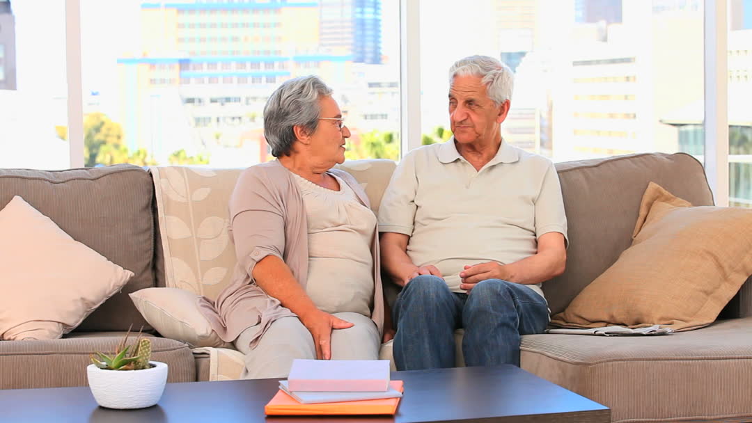 Elderly couple sits on a sofa in a casually elegant living room, deeply engaged in conversation. Their relaxed posture and attentive expressions emphasize a strong mutual bond and shared history, making this video suitable for themes involving family, retirement, relationships, and aging gracefully. Perfect for use in healthcare or retirement home promotional materials, representing warmth and connection.