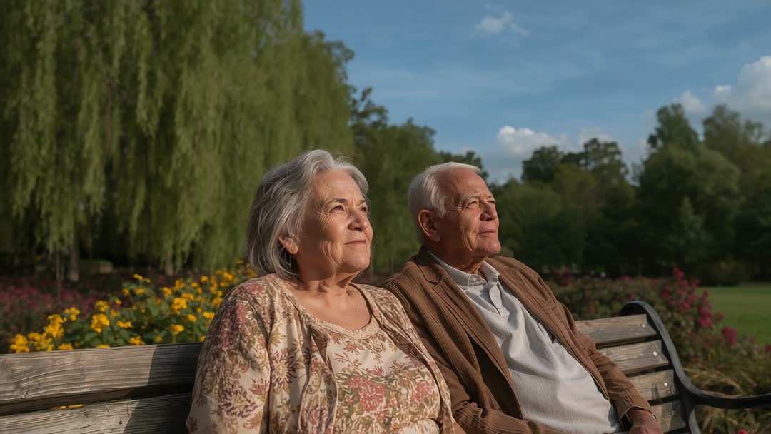 AI Generated Video. Footage showing senior couple sitting on park bench during golden hour, gazing upward as bird passes overhead. Composition highlighting warm sunlight, willow trees, and vibrant flower beds, with relaxed facial expressions conveying contentment and companionship. Use for retirement planning videos, healthcare and wellbeing campaigns, senior lifestyle features, travel and outdoor living promotions, and social media storytelling. Editing suggestions: begin with medium wide shot, cut to close-ups of faces and hands, add gentle slow push out and soft ambient music to enhance emotional tone. Recommend warm color grade, 16:9 framing, and provision of loopable segment for background use.