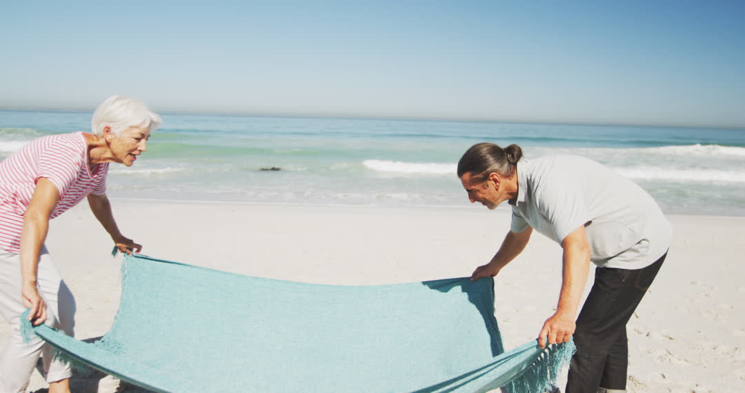 Senior couple arranging a blanket on sandy beach with blue sky and ocean in the background. Used for advertisements highlighting relaxation, travel, leisure, and idyllic vacations targeting retired individuals looking for serene and relaxing beach experiences.
