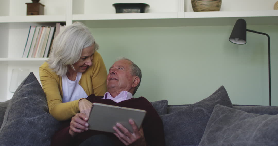 - Senior Couple Relaxing with Tablet on Comfortable Sofa