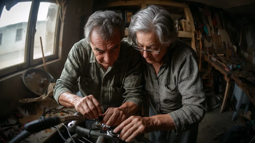 AI Generated Image. Frame from video showing senior couple repairing bicycle brake inside cluttered home workshop, using screwdriver and hand tools. Both wearing plaid shirts, leaning over handlebars, focusing on brake adjustment and fine tuning. Hands and tools appearing in close-up, highlighting precision, collaboration, manual skill and attention to detail. Natural daylight entering through window, creating warm working atmosphere. Suitable for illustrating DIY maintenance tutorials, senior lifestyle features, retirement hobby segments, community workshop promotions, safety and maintenance demonstrations. Useful for website headers, social media reels, instructional videos, magazine editorial about active aging, advertising for bike repair services or local craftsman classes.