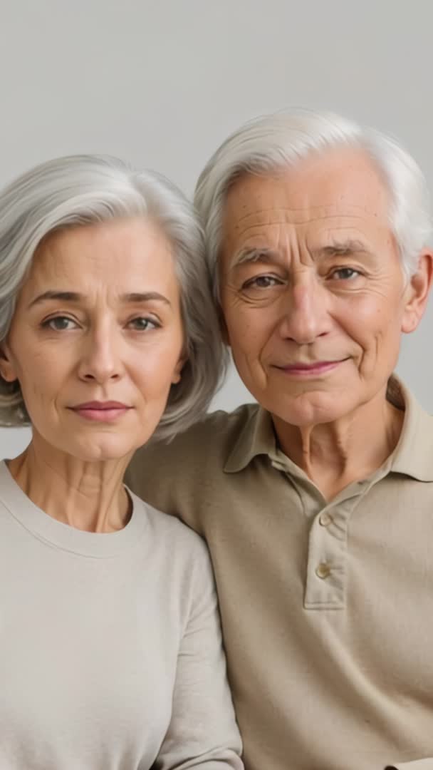 AI Generated Image. Featuring close-up vertical video of senior couple responding to timer with subtle blinking and arm shift in neutral studio. Capturing calm, intimate connection and quiet companionship. Conveying warmth, trust, and everyday tenderness for mature audiences. Working well for social media reels, mobile ads, healthcare and eldercare campaigns, retirement planning promotions, family storytelling, and relationship content. Suggesting edits: using slow motion for emphasis, looping short segment for background, adding soft instrumental track or voiceover, placing captions for mute playback. Fitting for hero mobile banners, testimonial sequences, clinic waiting room screens, senior services websites, and lifestyle blogs.