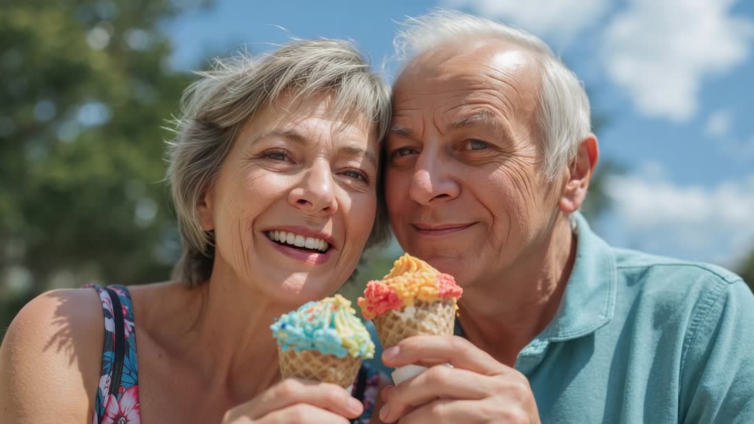 AI Generated Image. Video showing senior couple smiling and holding colorful ice cream waffle cones in sunny park, capturing warm facial expressions and close connection. Close-up framing highlighting gentle smiles, light wrinkles, and playful interaction while leaning together. Natural light and shallow depth of field creating soft, inviting mood with vibrant pastel dessert colors. Useful for marketing retirement lifestyle, senior travel, dental and healthcare campaigns, dating services for older adults, food and dessert brands, summer event promotions, community center outreach, lifestyle blogs, social media reels and editorial features. Suggested usage includes hero clip for landing pages, looping background for website banners, 6-15 second social ads, print and digital brochure covers. Editing suggestions: using gentle slow motion, applying warm color grade, adding light instrumental music, reserving top right area for headline and call-to-action. Alternative crops: square for Instagram, vertical for stories and reels, wide for website headers.