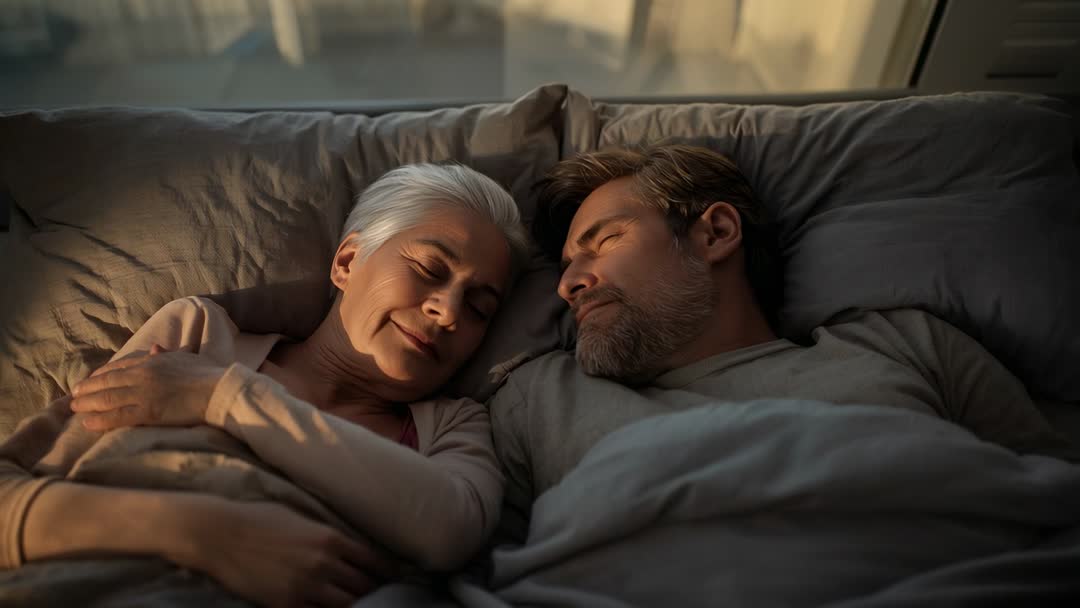 - Senior couple sleeping peacefully in sunlit bed sharing warm blanket at dawn